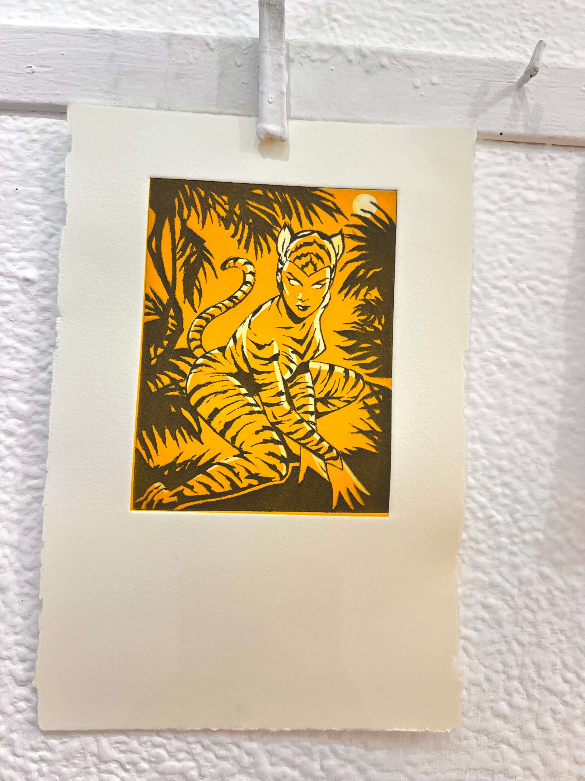 Este linograbado está impreso sobre papel algodón, en una edición limitada y firmada. Como ilustradora y tatuadora, me encanta explorar distintas formas de llevar mi universo visual al papel, y este grabado es uno de los que más disfruto compartir.