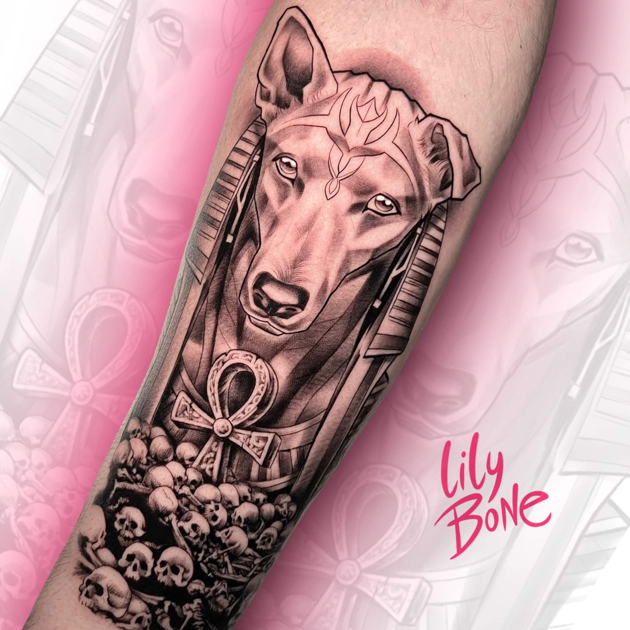Este tatuaje representa al dios Anubis, deidad egipcia de la muerte y la protección de las almas. Una figura poderosa, simbólica y cargada de misticismo, ejecutada con un impresionante nivel de detalle por Lily Bone.