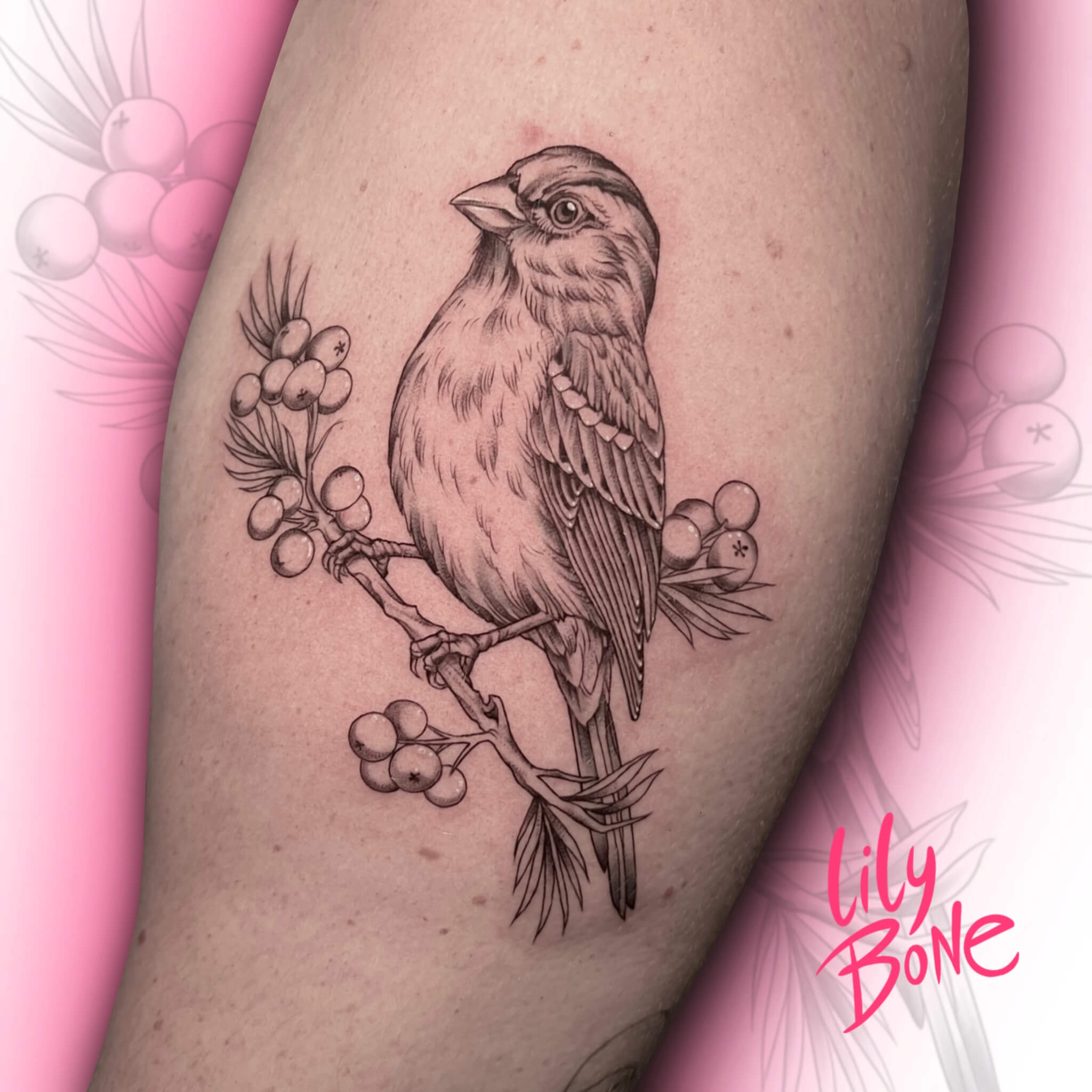Tatuaje finamente detallado de un gorrión posado sobre una rama con pequeños frutos. Realizado en tinta negra, el diseño resalta por su trazo preciso y sombreado suave, evocando una escena natural tranquila y delicada.