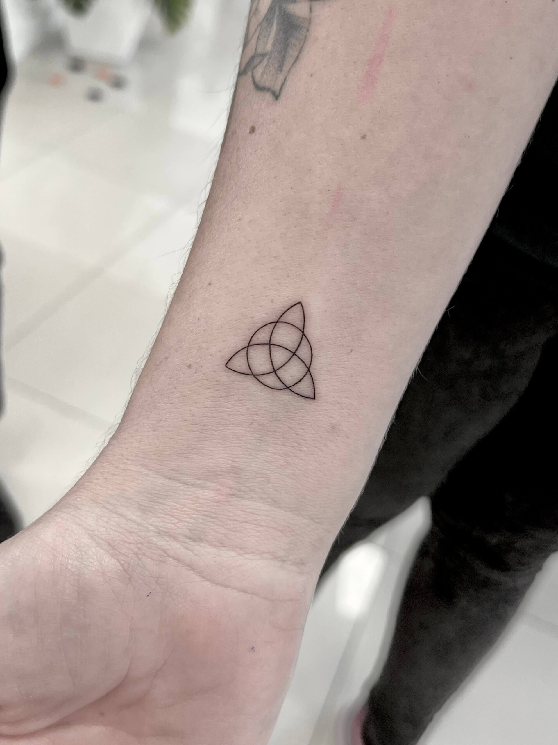 Los tatuajes pequeños también encierran grandes significados. Este diseño minimalista de un nudo celta triqueta, realizado por Lily Bone, es un ejemplo perfecto de elegancia, espiritualidad y precisión.