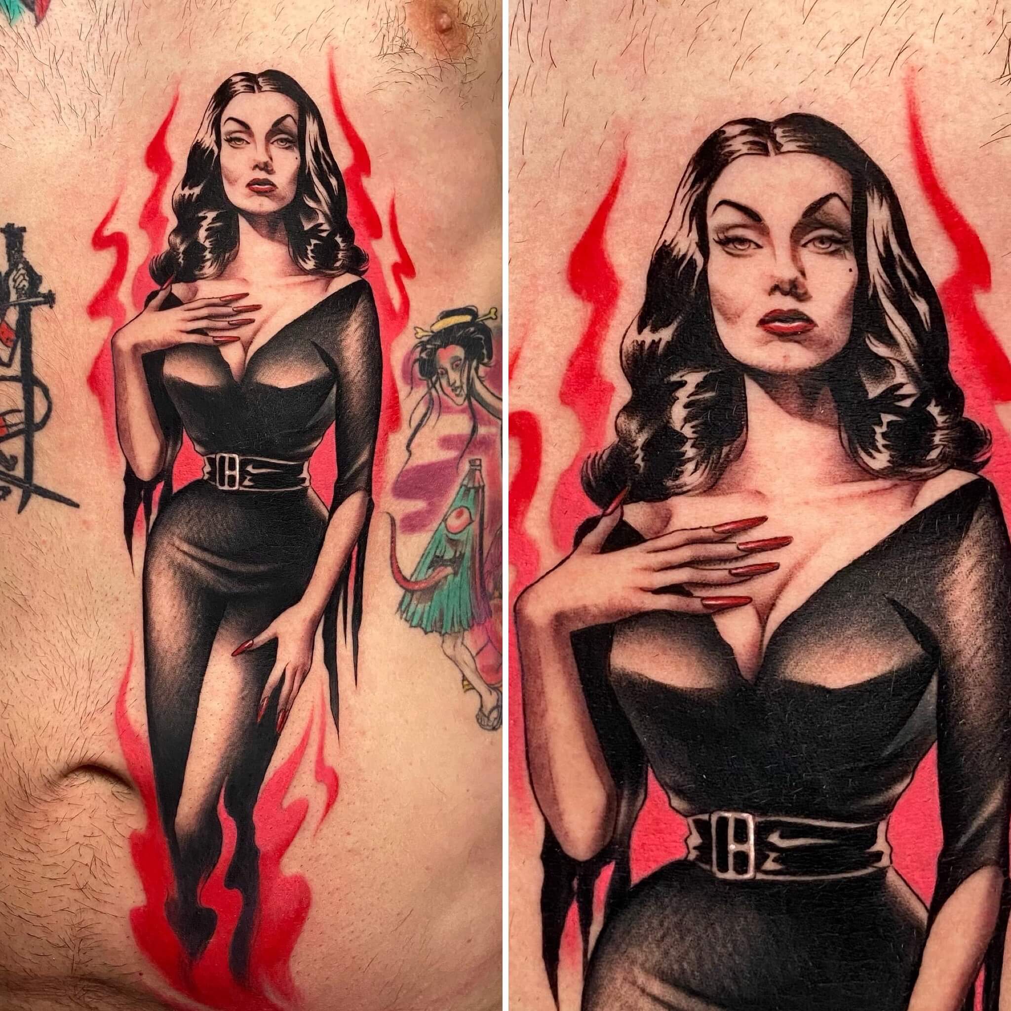 Este poderoso tatuaje rinde tributo a Maila Nurmi, actriz finlandesa-estadounidense que dio vida a Vampira, el icónico personaje gótico de los años 50. Con su distintiva silueta, mirada penetrante y un aura envolvente de fuego, el diseño captura la esencia de la primera “horror host” de la televisión.